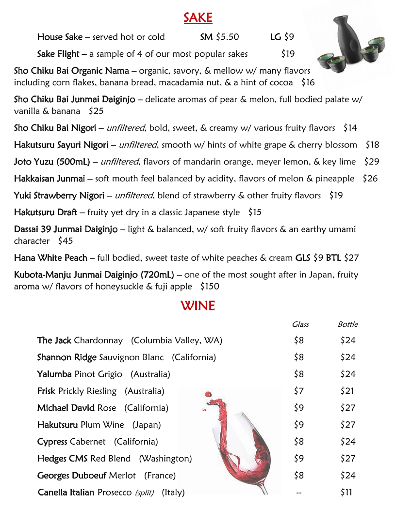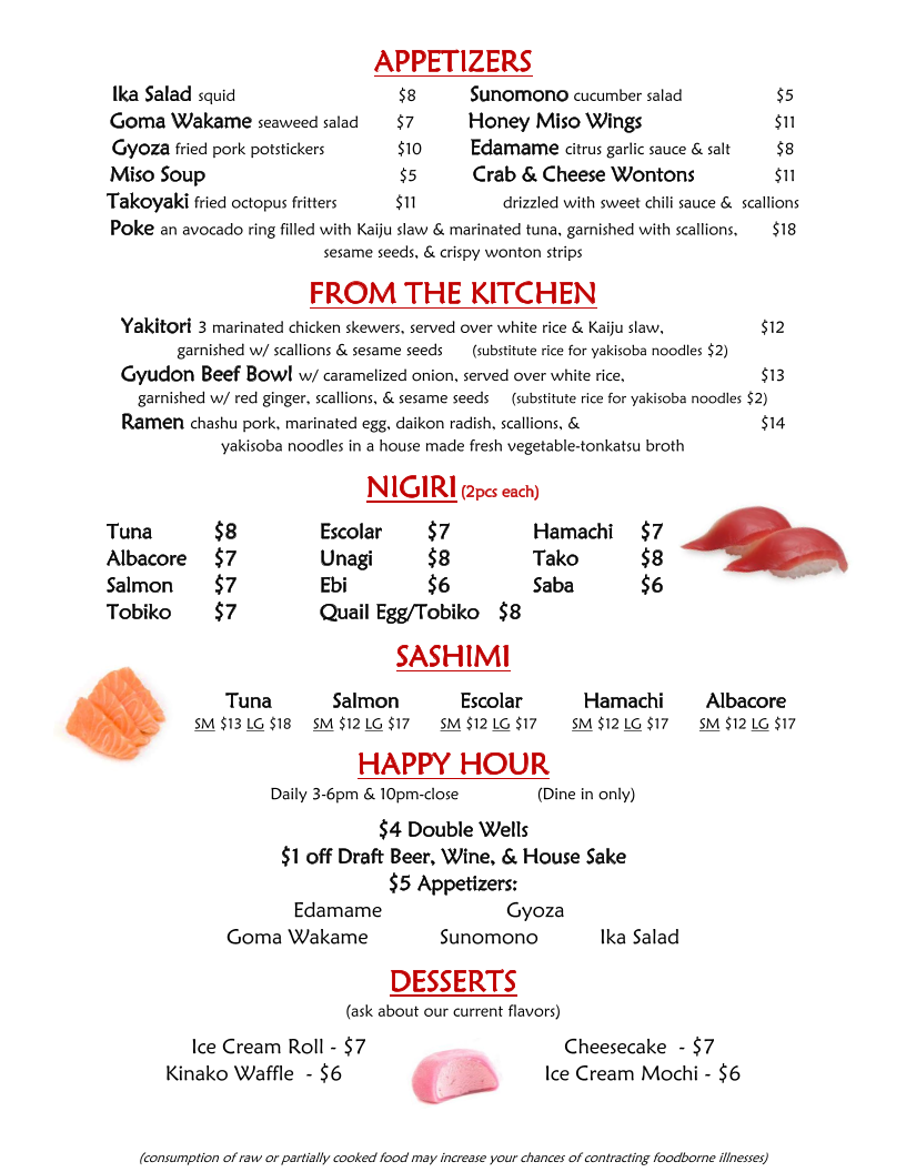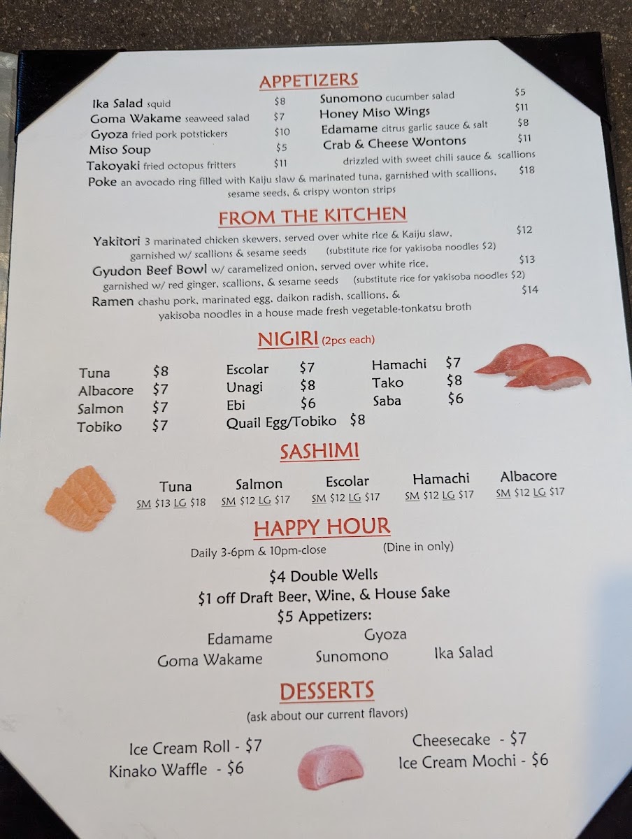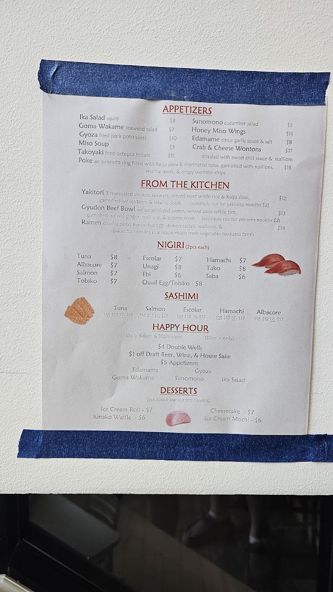 Kaiju Sushi & Spirits, where culinary craftsmanship meets a delightful dining experience in the heart of Coeur d'Alene at 424 Sherman Ave. Our menu is a vibrant celebration of traditional and modern Japanese cuisine, crafted to tantalize your taste buds. Dive into our highlights like the spicy tuna, guaranteed to ignite your palate, or savor the comforting warmth of our miso soup. Don't miss the California roll, a classic favorite, and our signature miso glazed wings for a unique twist. For seafood lovers, our nigiri and sashimi assortments showcase the freshest catches, while vegetarians will delight in the tofu veggie roll and veggie tempura. Complement your meal with a refreshing Ramune Japanese soda or a traditional sake sunrise. Be sure to save room for our chef's choice cheesecake, a sweet finale to your dining adventure. Whether you’re enjoying a cozy meal for two or opting for our family plate, Kaiju Sushi & Spirits invites you to savor a culinary journey that you won't soon forget!